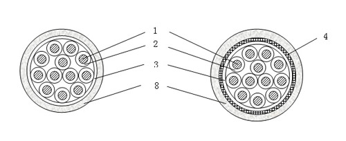 5--- 銅帶屏蔽; 6--- 內(nèi)護(hù)層; 7--- 鋼帶鎧裝; 8--- 聚烯烴護(hù)套。